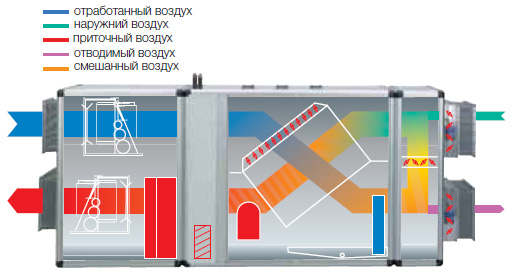 Потери тепла c уходящим воздухом компенсируются с помощью интегрированного в прибор водяного калорифера, подключенного к системе отопления здания. При необходимости, в систему можно встроить дополнительный водяной калорифер большей мощности или электрические тэны.