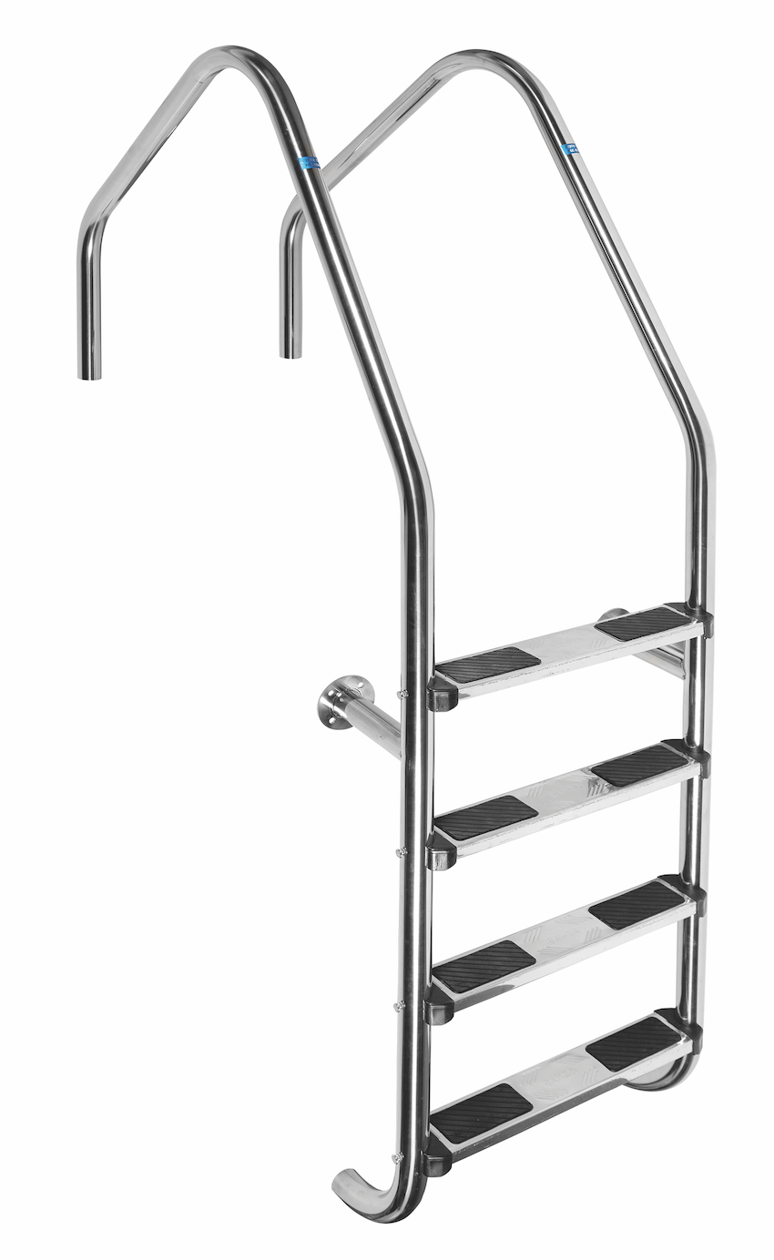 Крепежные элементы - закладные стаканы, фиксаторы, болты и саморезы. Лестница предназначена для полностью заглубленных переливных бассейнов имеющих широкий борт. Верхняя часть поручней опускается в стаканы. Нижняя часть упирается в стену бассейна. Ступени крепятся к поручням с помощью болтов